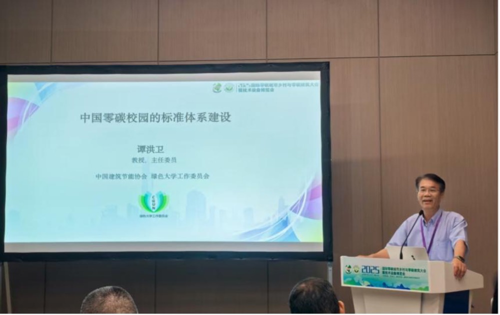 特邀演讲环节中,同济大学教授、中国建筑节能协会绿色大学工委会主任谭洪卫系统回答了何为零碳校园、如何建设零碳校园、如何构建中国高校零碳校园标准体系等关键问题。演讲同步介绍了已发布的《校园碳排放核算指南》及其配套高校校园碳排放核算平台,并详细解读了《零碳校园评价标准》的三级指标框架。